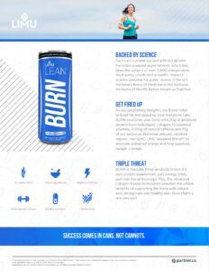 LIMU LEAN® BURN – Here’s the Skinny Meet LIMU LEAN BURN — this power-packed 3-in-1 product is part protein supplement, part energy drink, part nutritional beverage. It controls your appetite, curbs your cravings and accelerates weight loss. Plus, this advanced collagen-based formulation provides the added benefits of supporting the body with radiant skin, strong nails and healthy skin. Now, that’s a win-win-win! The video introduces Burn, a product designed to help with weight management by targeting appetite and boosting fat reduction. Featuring ingredients like collagen protein and natural caffeine, Burn aims to help you reach your weight loss goals. It’s the hottest and healthiest way to lose weight fast!