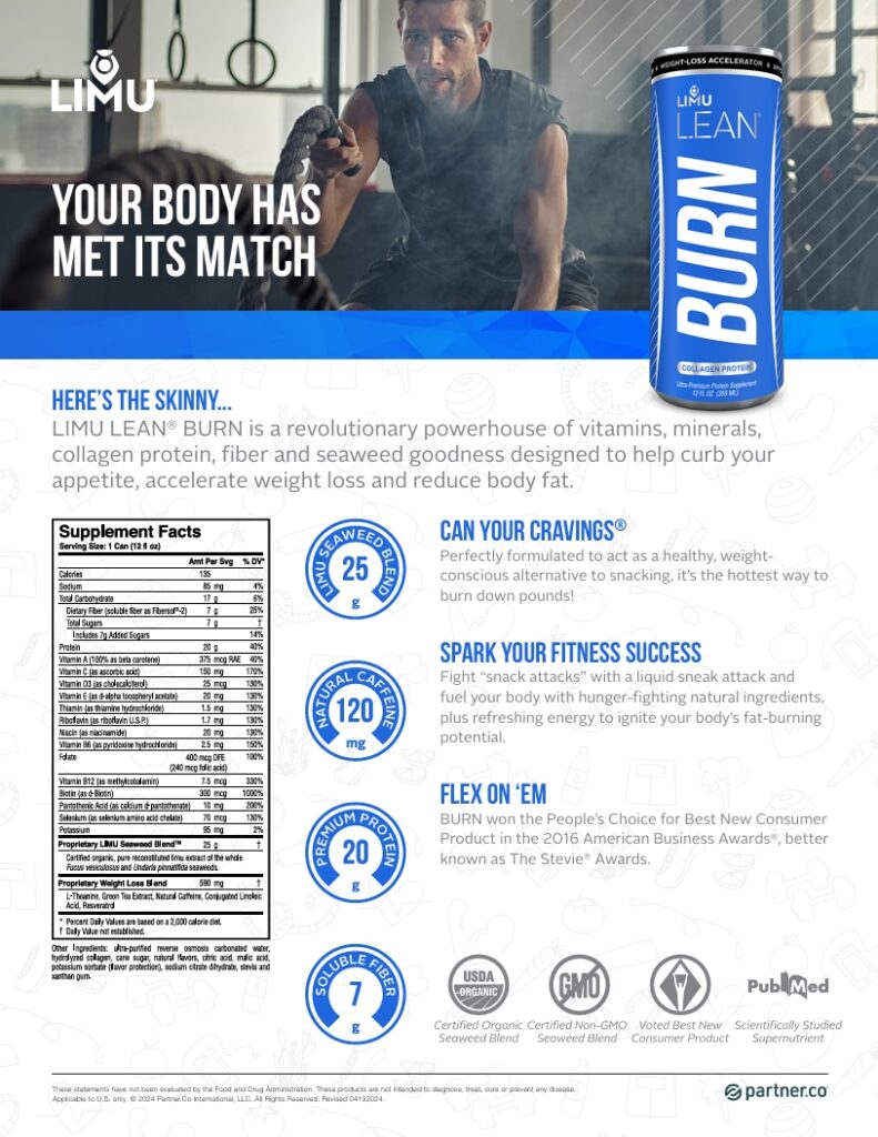 LIMU LEAN® BURN – Here’s the Skinny Meet LIMU LEAN BURN — this power-packed 3-in-1 product is part protein supplement, part energy drink, part nutritional beverage. It controls your appetite, curbs your cravings and accelerates weight loss. Plus, this advanced collagen-based formulation provides the added benefits of supporting the body with radiant skin, strong nails and healthy skin. Now, that’s a win-win-win! The video introduces Burn, a product designed to help with weight management by targeting appetite and boosting fat reduction. Featuring ingredients like collagen protein and natural caffeine, Burn aims to help you reach your weight loss goals. It’s the hottest and healthiest way to lose weight fast!