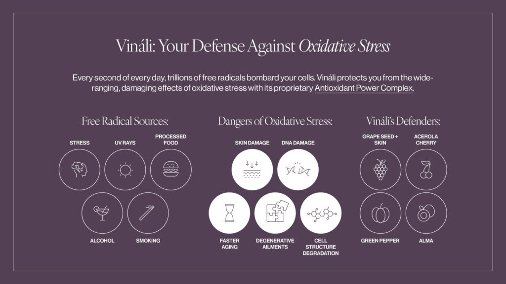 Stop free radical damage before it starts with Vináli, a super-potent, broad-spectrum antioxidant blend that protects the body — especially the skin — from the long-term effects of oxidative damage.